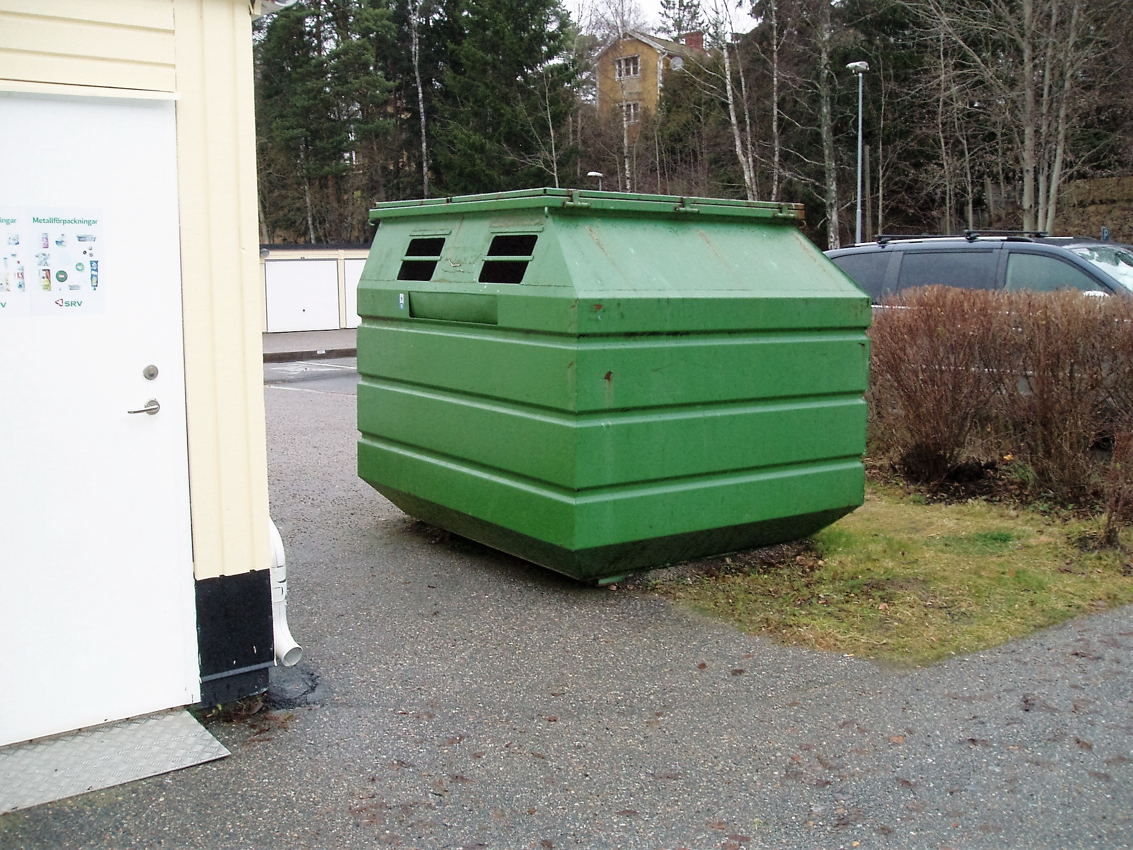 I söder finns ett stort rum med två dörrar. Till vänster läggas våra brännbara hushållssopor, som kallas för Restavfall. Rakt fram i rummet läggs tidningar och annat returpapper. Till höger finns kärl för förpackningar av metall och plast samt ett kärl för matavfall. Pappersförpackningar lägger du i den stora containern vid parkeringen.